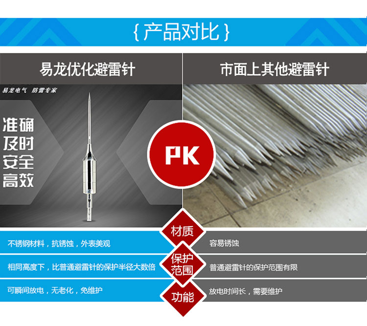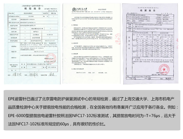 EPE系列提前放電避雷針(以下簡稱EPE避雷針)采用法國技術,符合法國NFC17-102標準。它由三種系統(tǒng)(大氣電力電容器、高壓脈沖發(fā)送系統(tǒng)、電流泄放系統(tǒng))組成,具有雙重瞬間放電裝置,被多層的具有隔絕惡劣環(huán)境及水密性的材料所保護;無老化危險,免維護。在相同的安裝高度下,比普通瞬間避雷針的保護半徑大數(shù)倍,搶先放電時間為30μs~60μs,即優(yōu)先引雷入地。